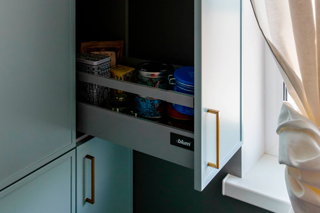 Верхние шкафы открываются с помощью врезной ручки Gola для верхних модулей, которая дает возможность сохранить внешний эстетичный вид без ручек и позволяет удобно пользоваться шкафами.