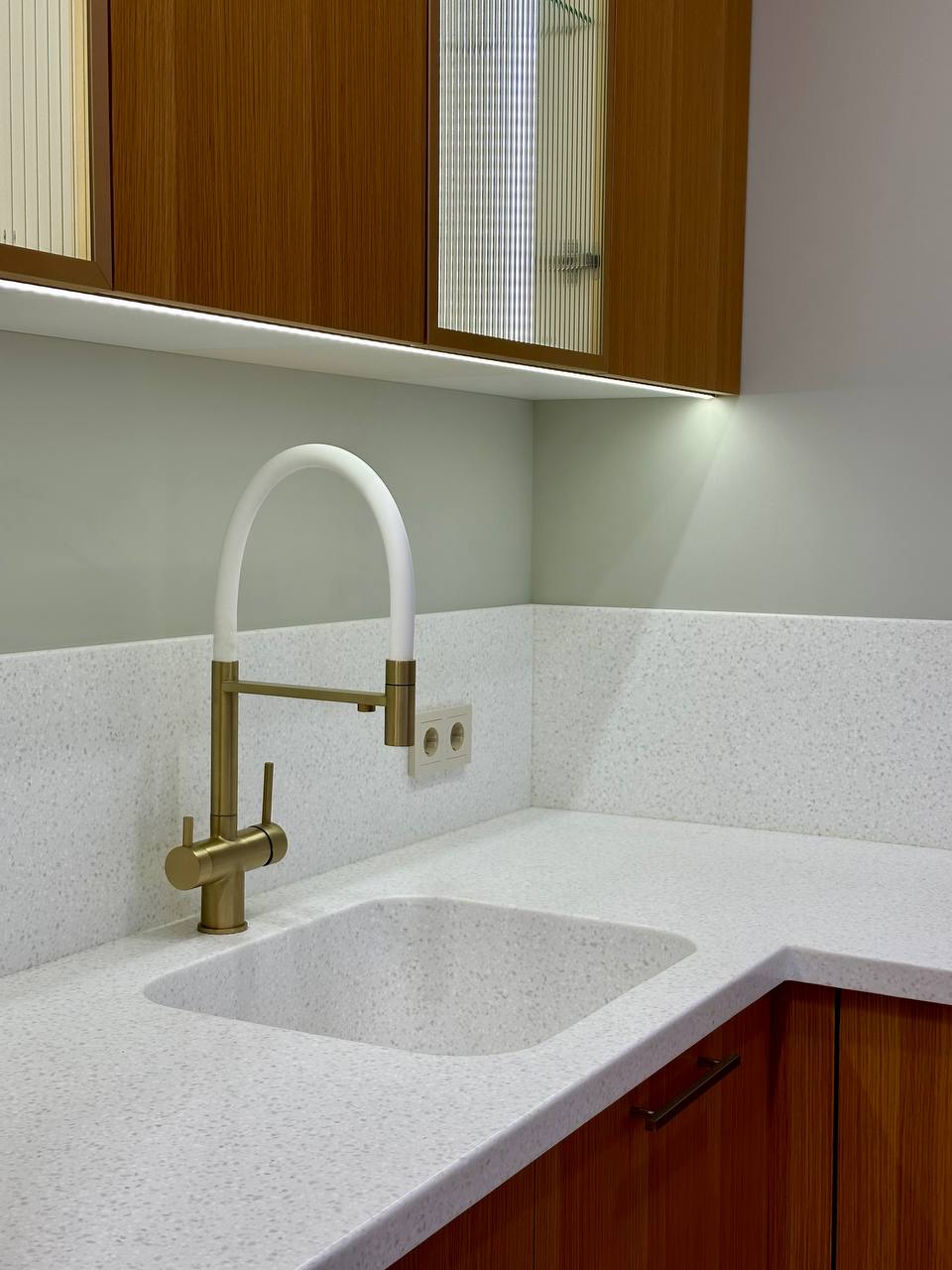 Столешница из акрилового камня, где фартук не во всю высоту, а в виде элегантного канта, подчеркивающий утонченность кухни.