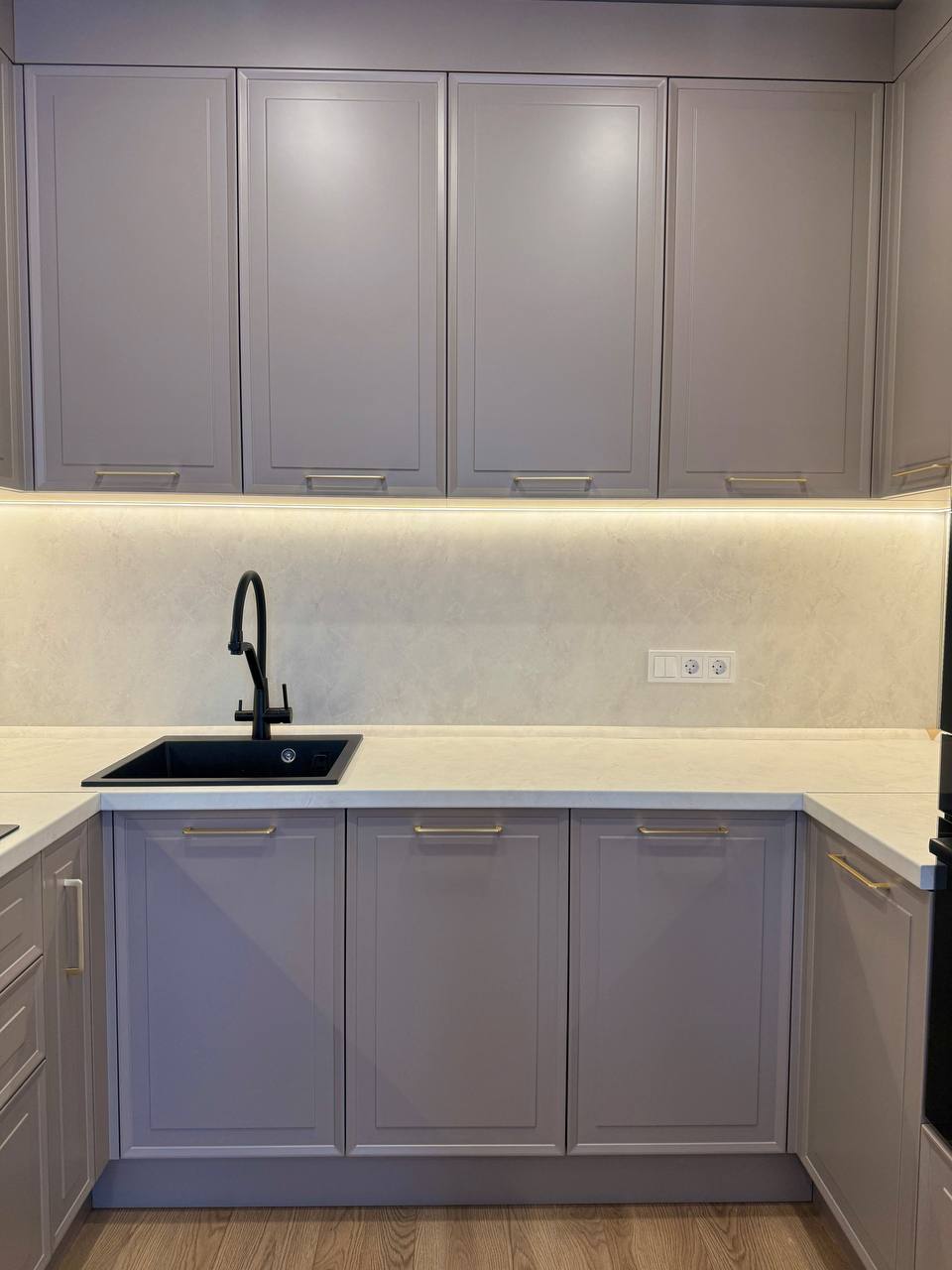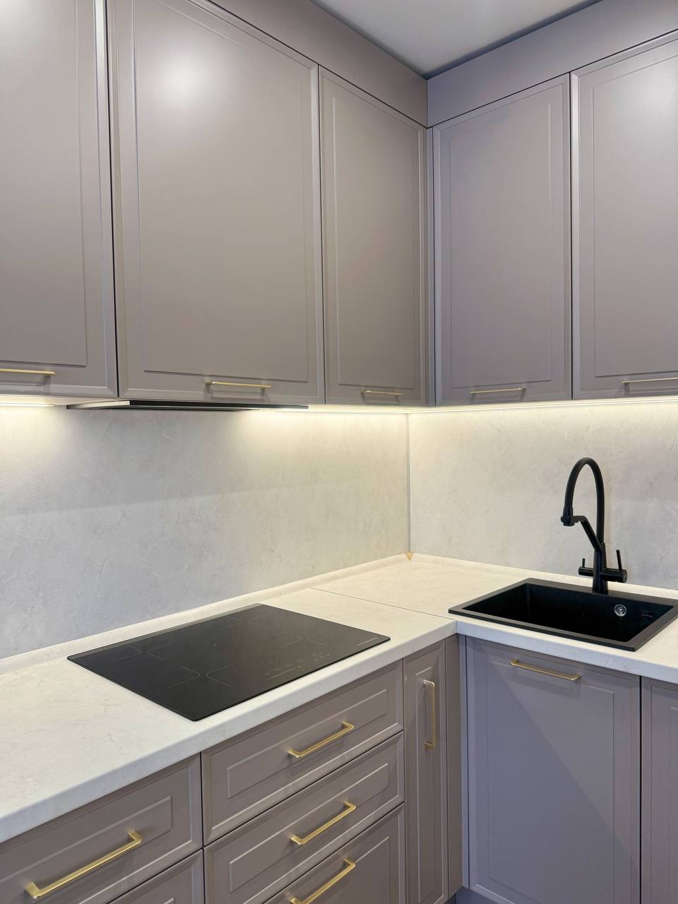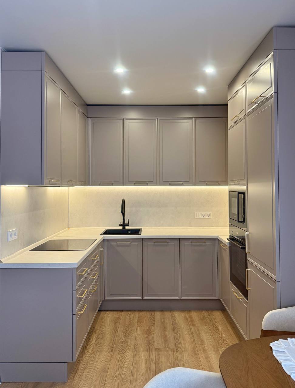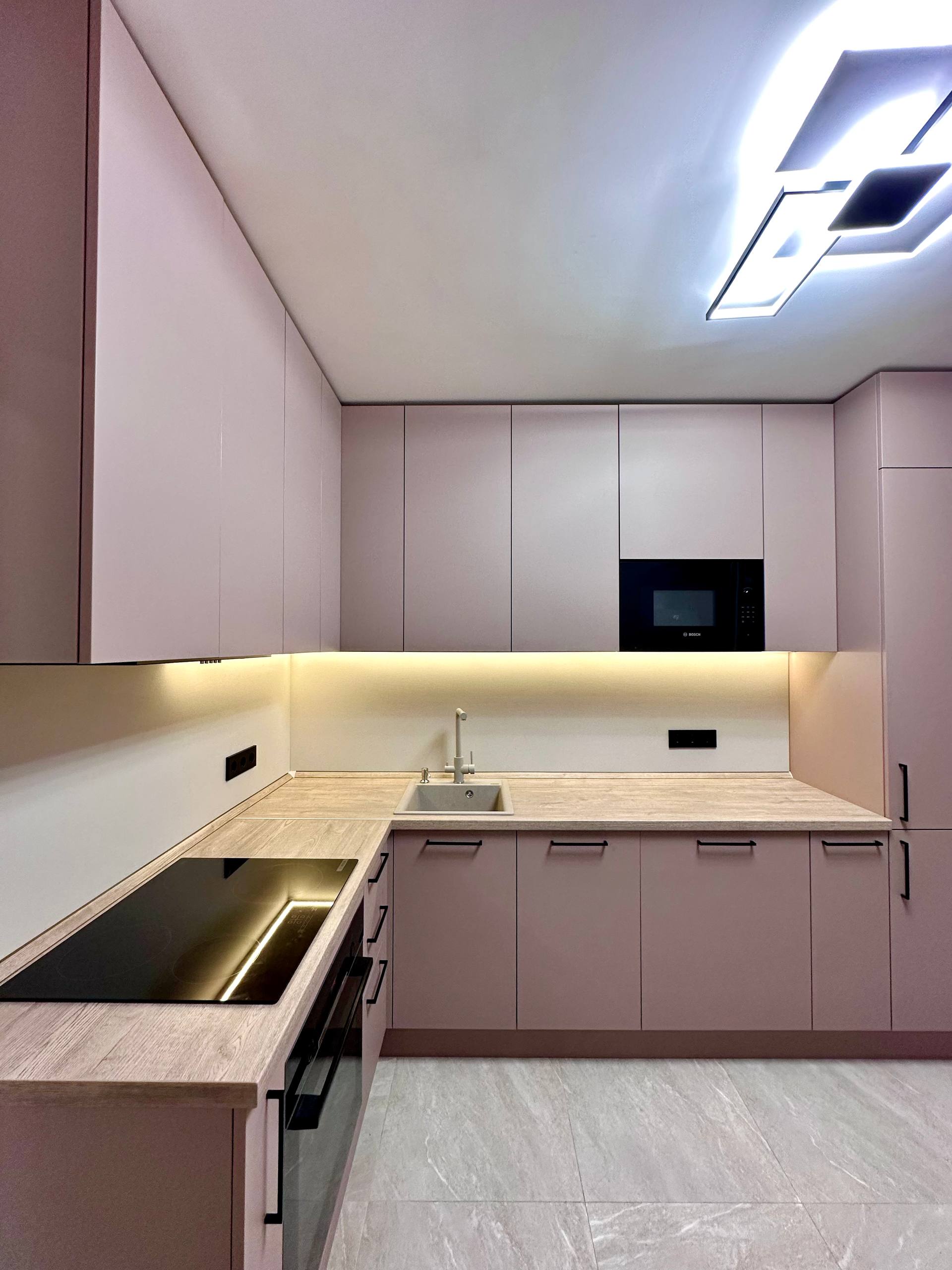 • Светлый, ненавязчивый фартук и столешница идеально дополняют образ, делая пространство визуально больше.