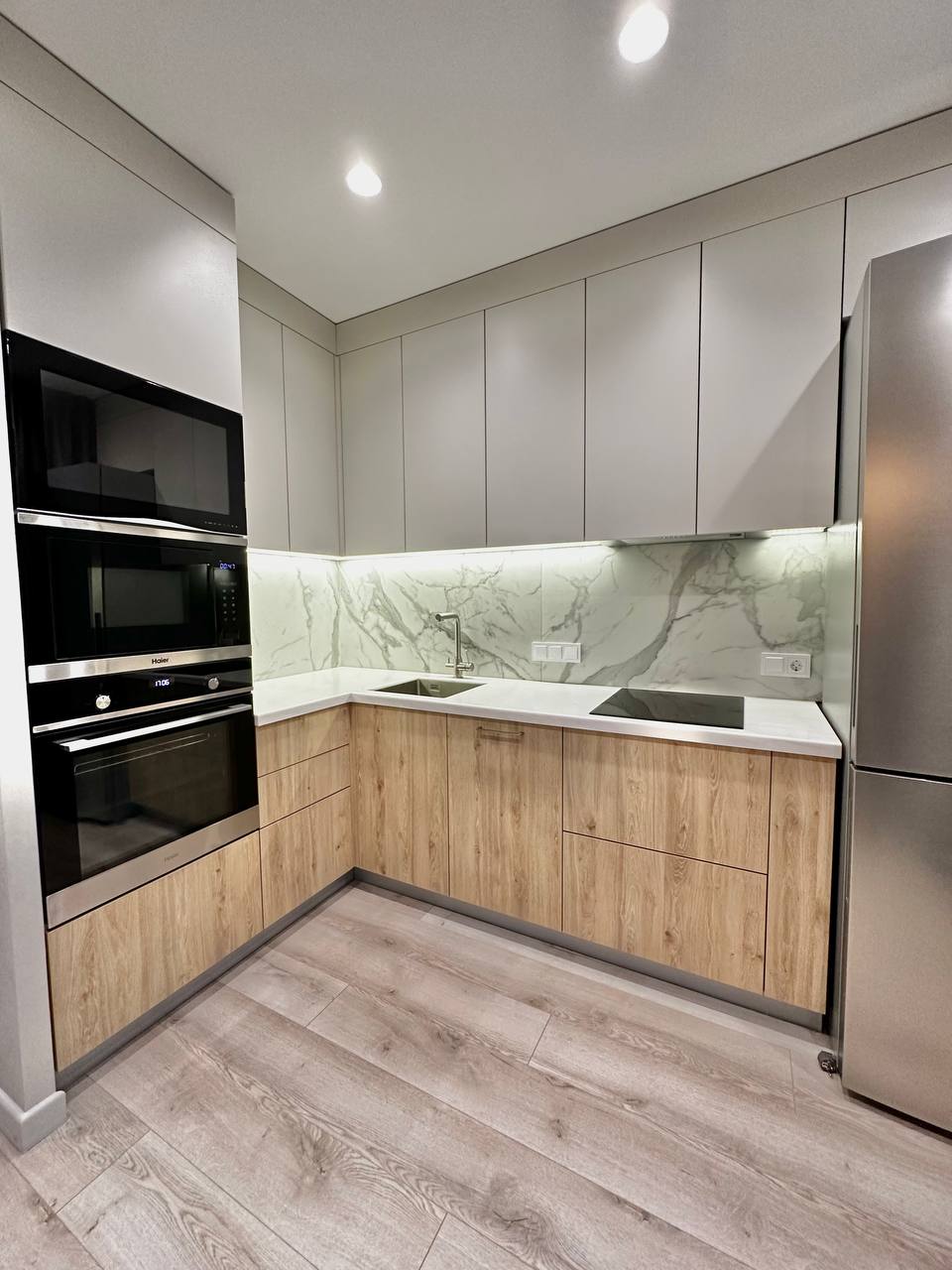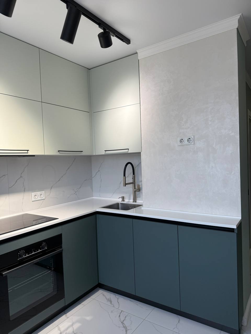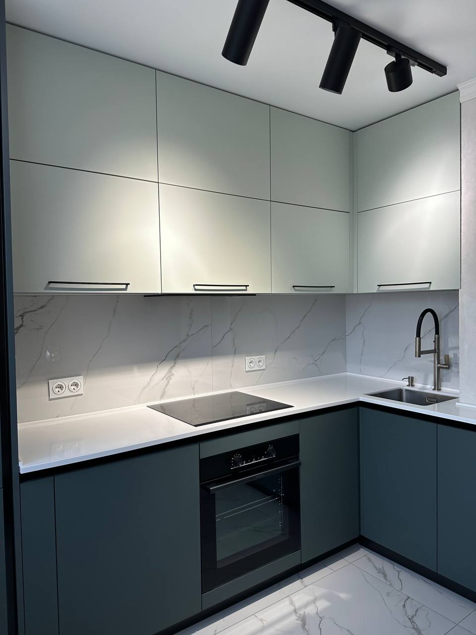 • Светлый, ненавязчивый фартук и столешница идеально дополняют образ, делая пространство визуально больше.