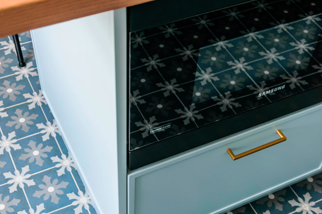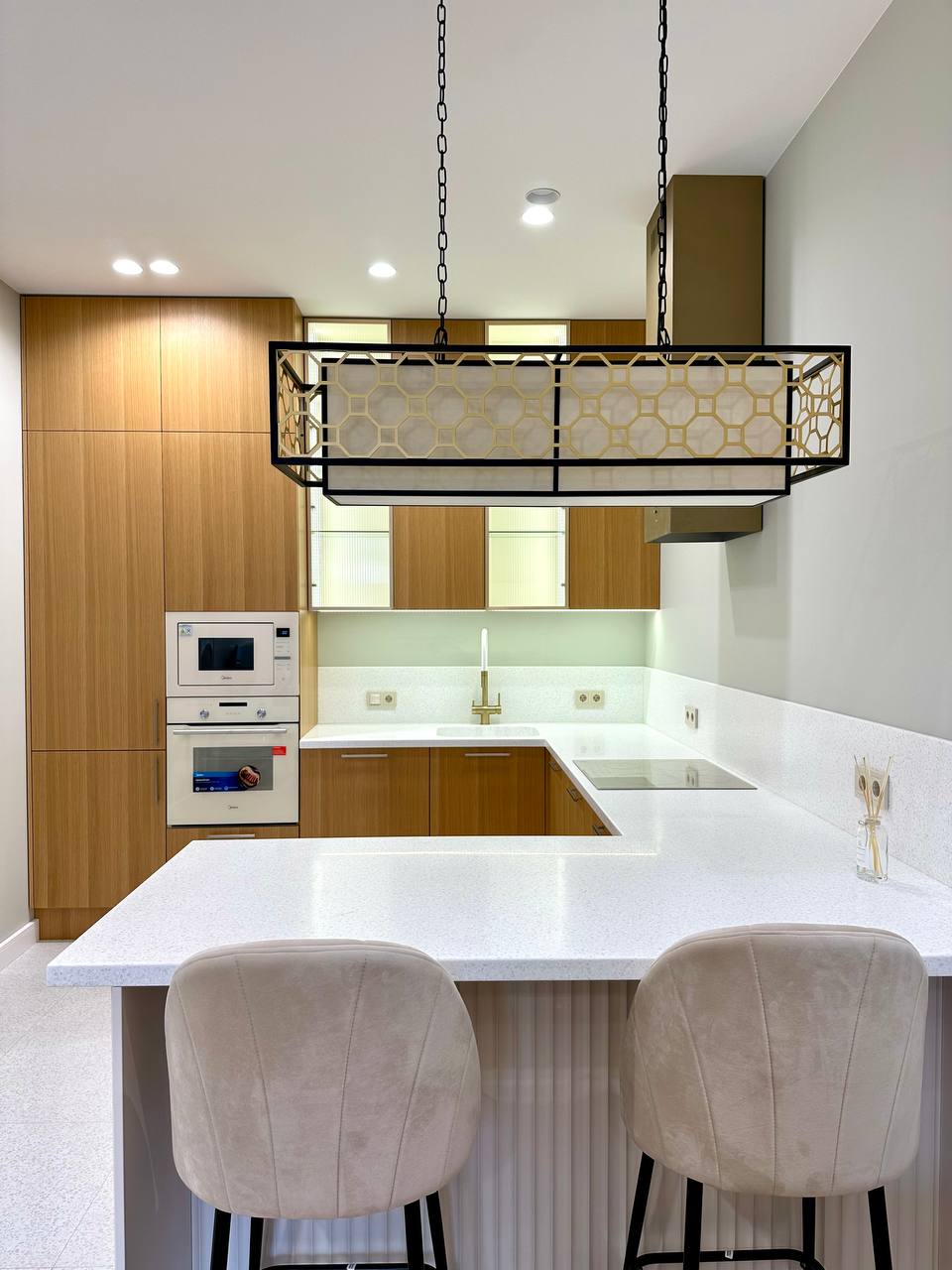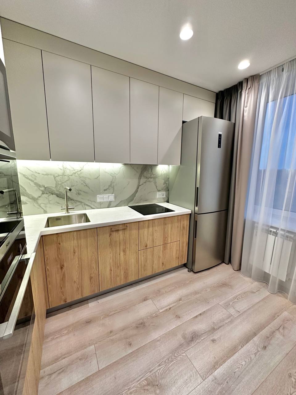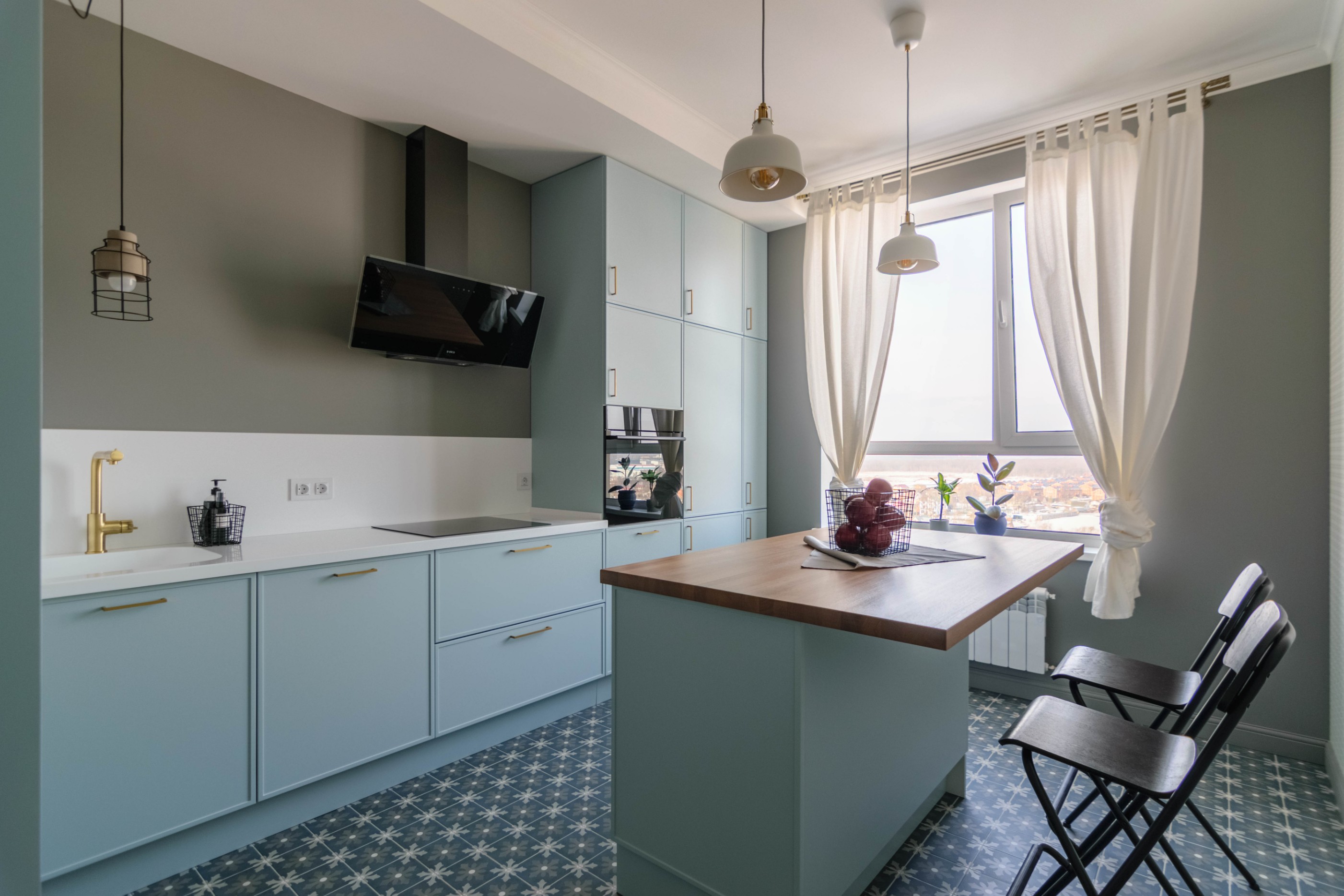 • Светлый, ненавязчивый фартук и столешница идеально дополняют образ, делая пространство визуально больше.