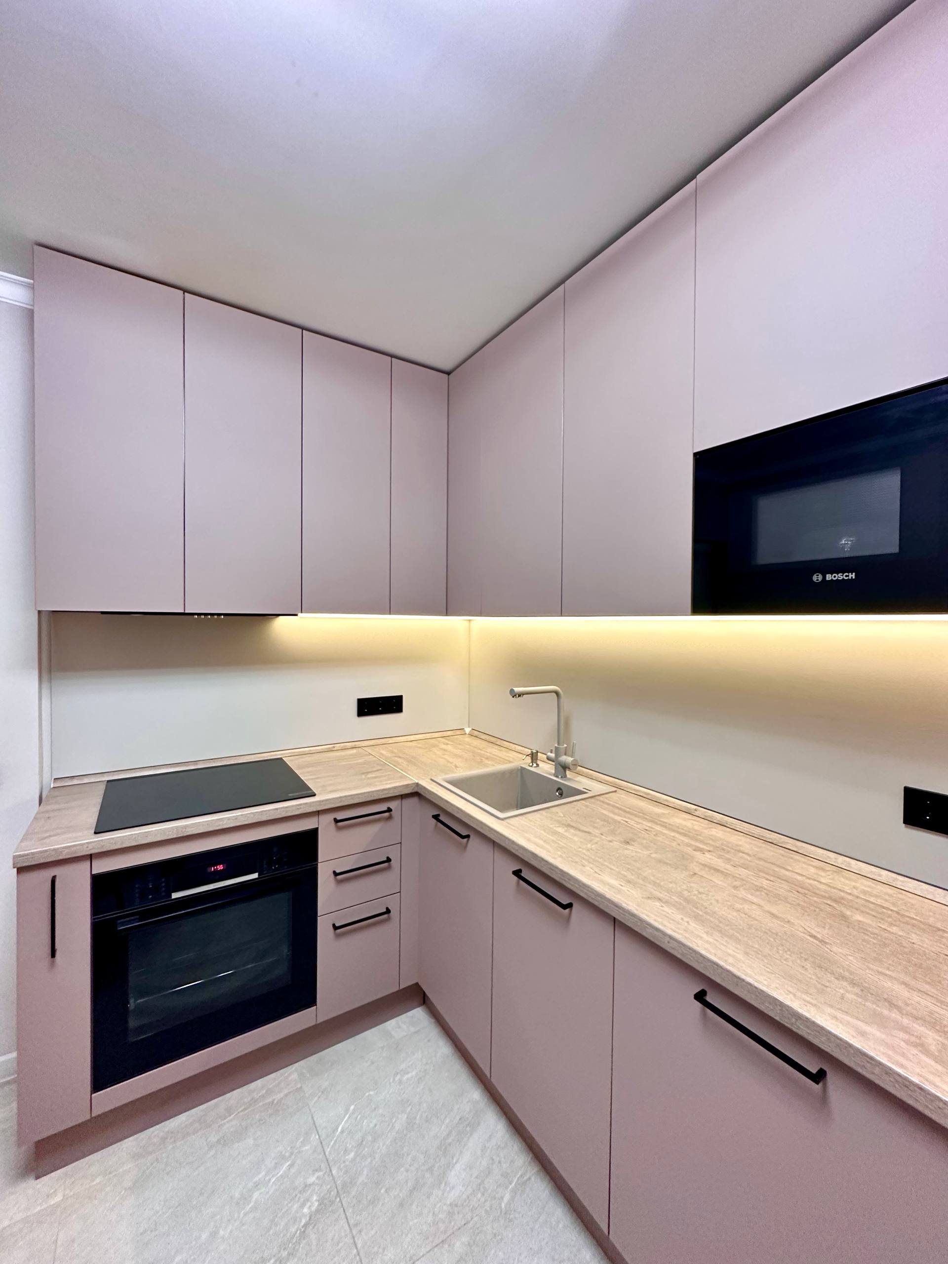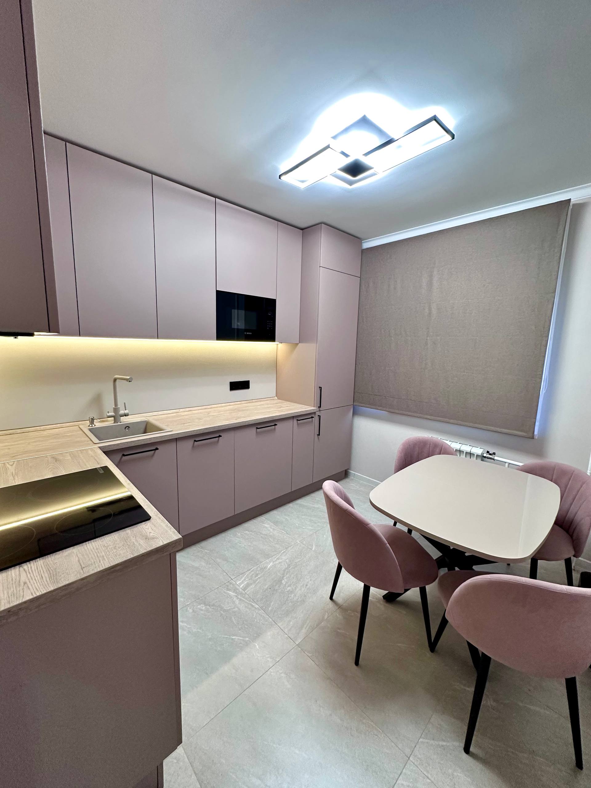 ▪️Мягкий, но выразительный цвет: Вместо ярких акцентов здесь ставка на глубину и нежность пудрового розового, который идеально сочетается с теплым деревом столешницы.