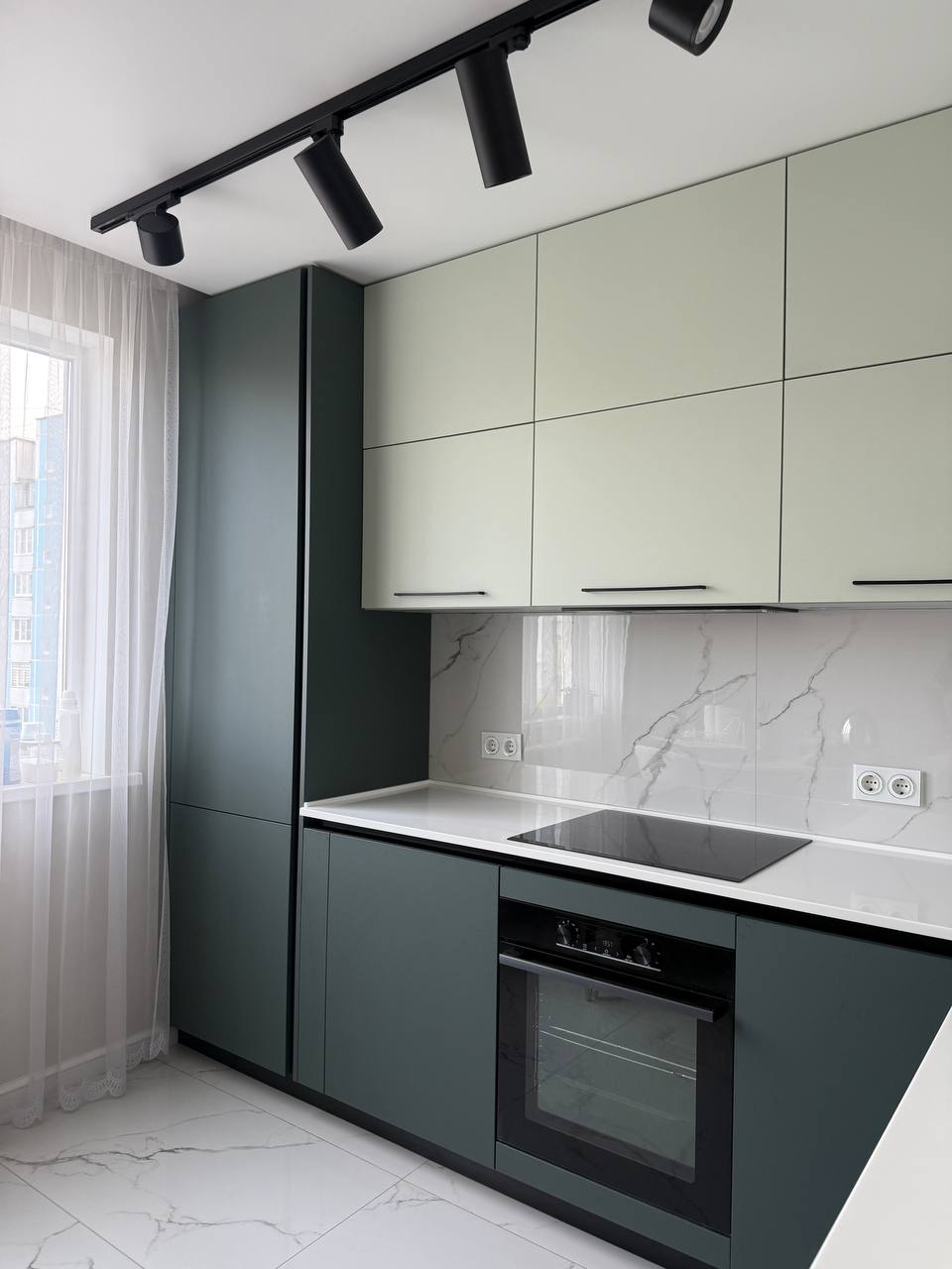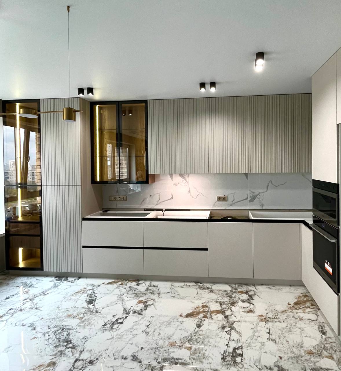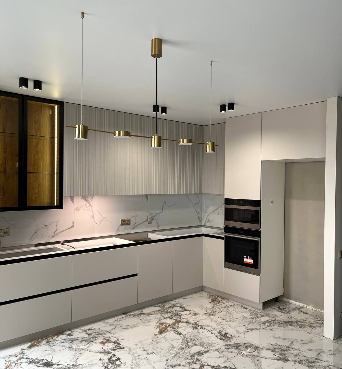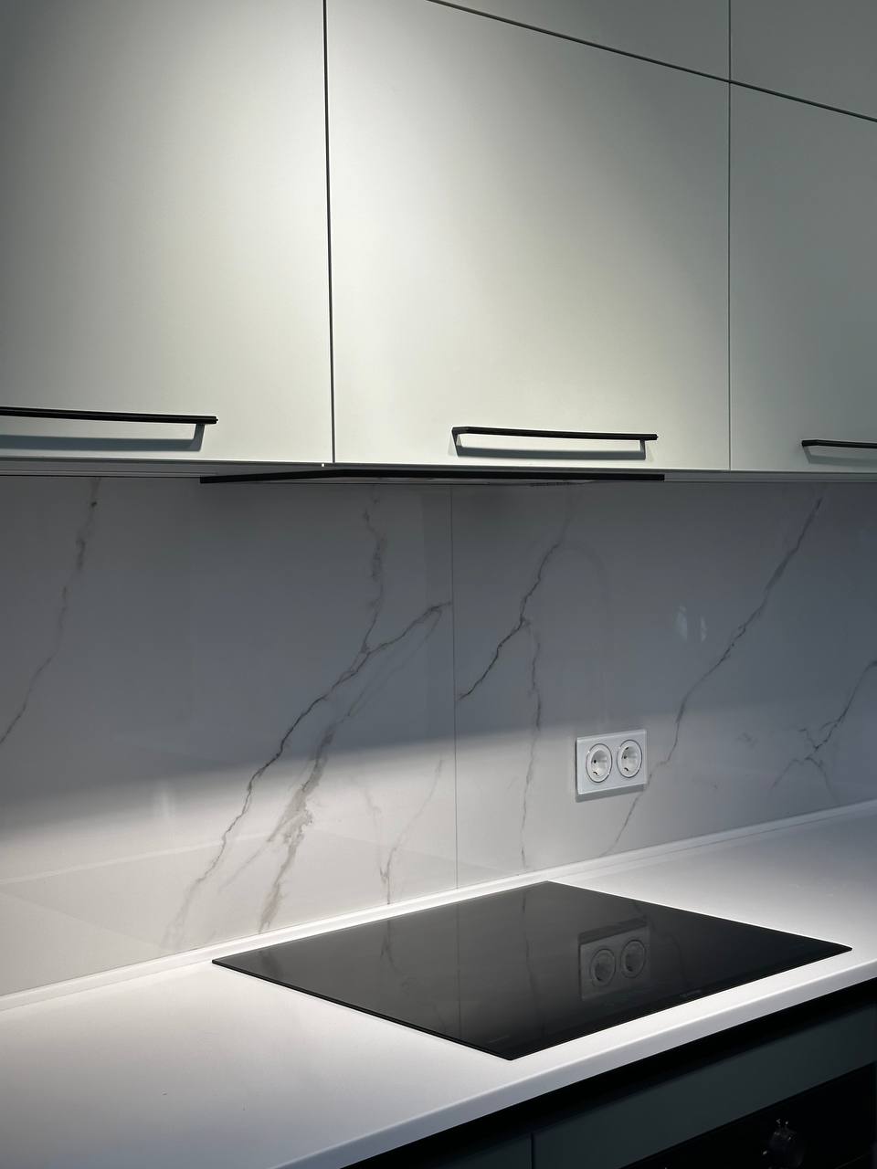 ▪️Темные детали: Черные тонкие ручки и розетки на фартуке выглядят как стильные акценты, добавляя интерьеру современности и четкости.