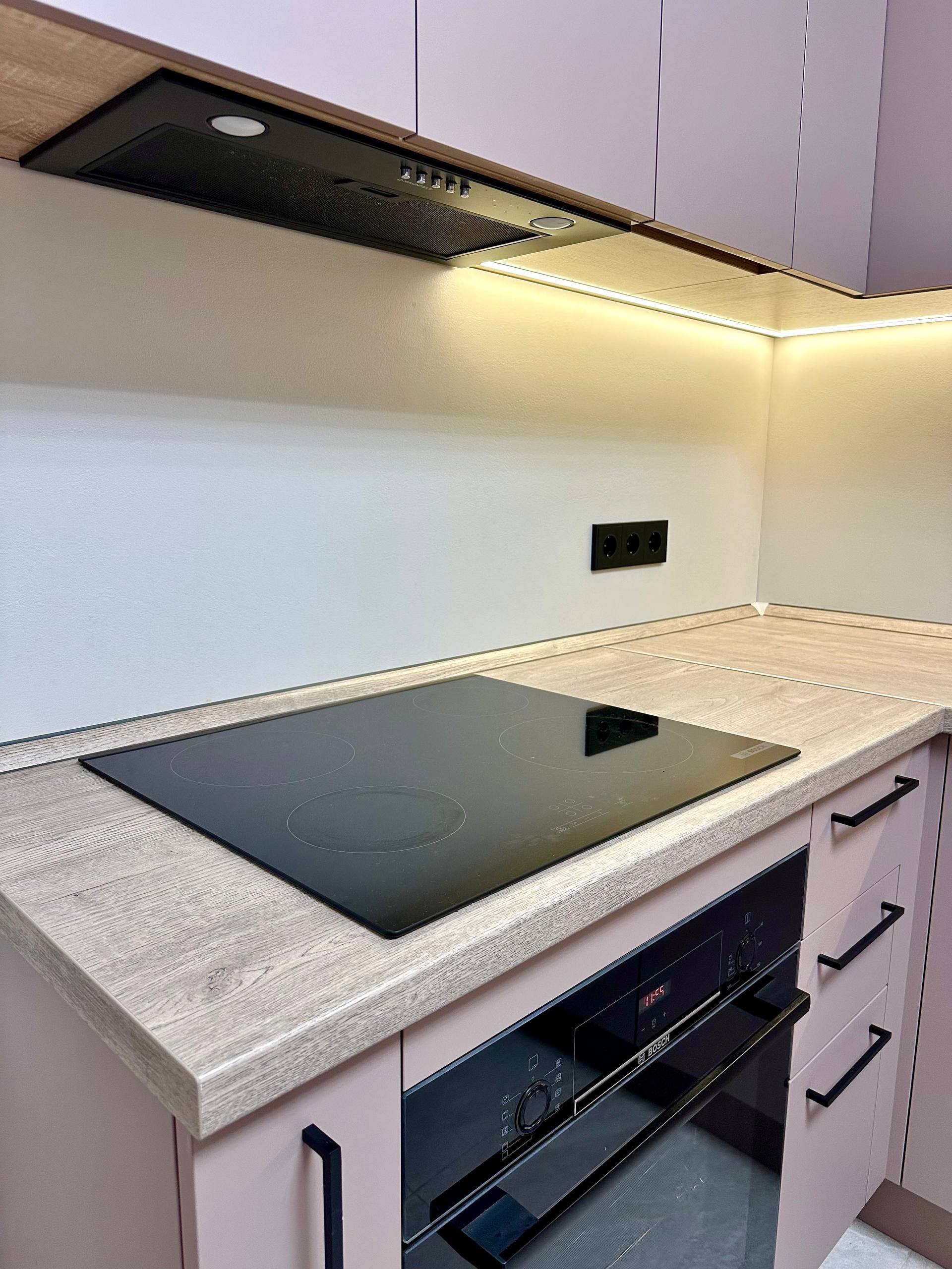 ▪️Продуманное освещение: Встроенная подсветка рабочей зоны не только практична, но и подчеркивает текстуру столешницы, создавая уютный ореол.